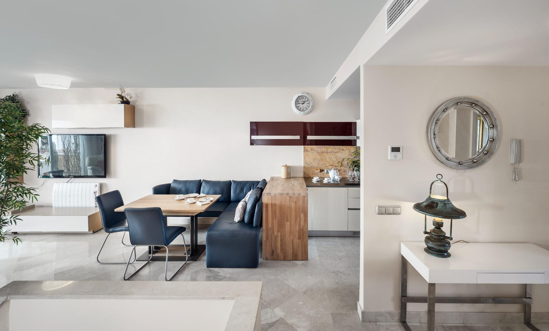 The top floor has a additional living space with dining area and amazing sea views from the large window which could serve as a third bedroom. There is also a solarium terrace with built-in outdoor kitchen for BBQs, where you can enjoy village and sea views.