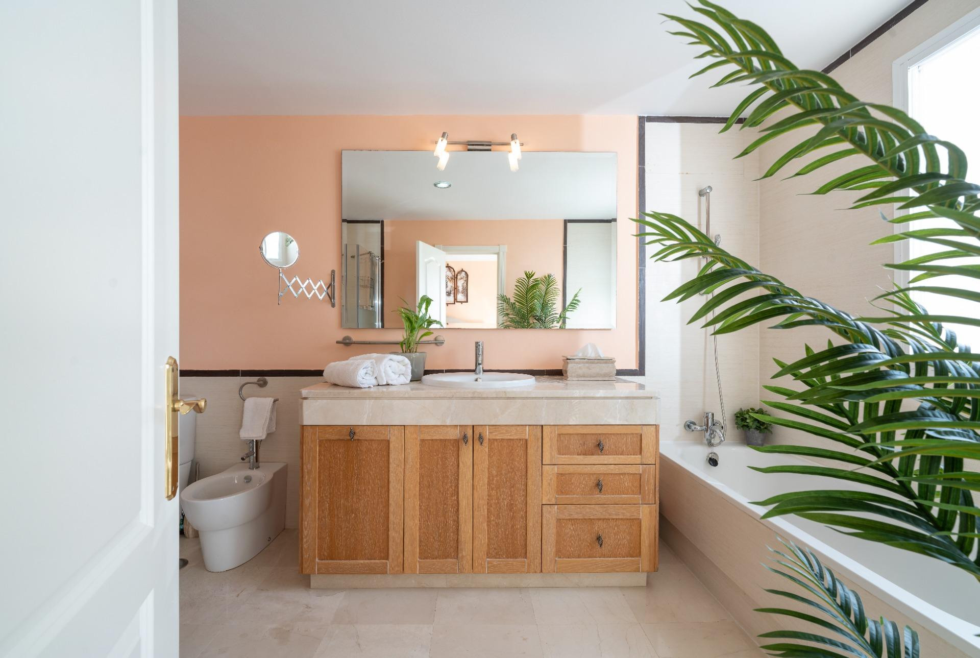 On the first floor are two double bedrooms, each with fitted wardrobes. The master bedroom includes a full bathroom and a private terrace with partial sea views. There is also an additional full bathroom on this floor.