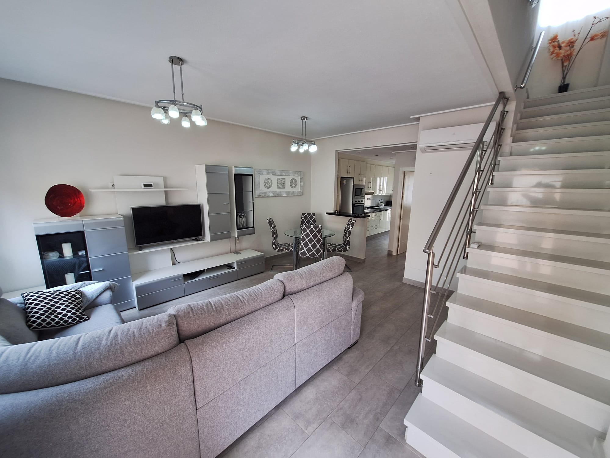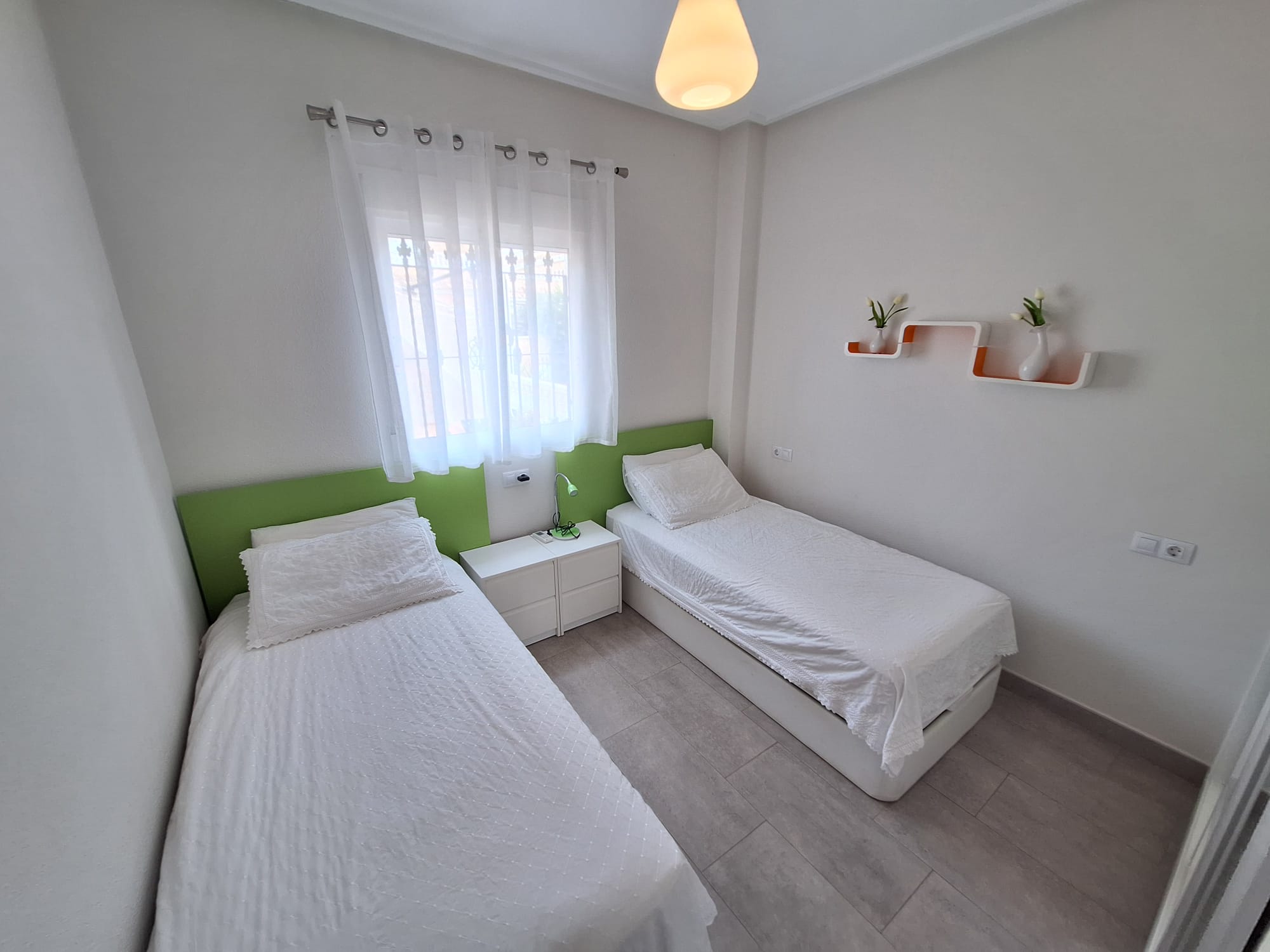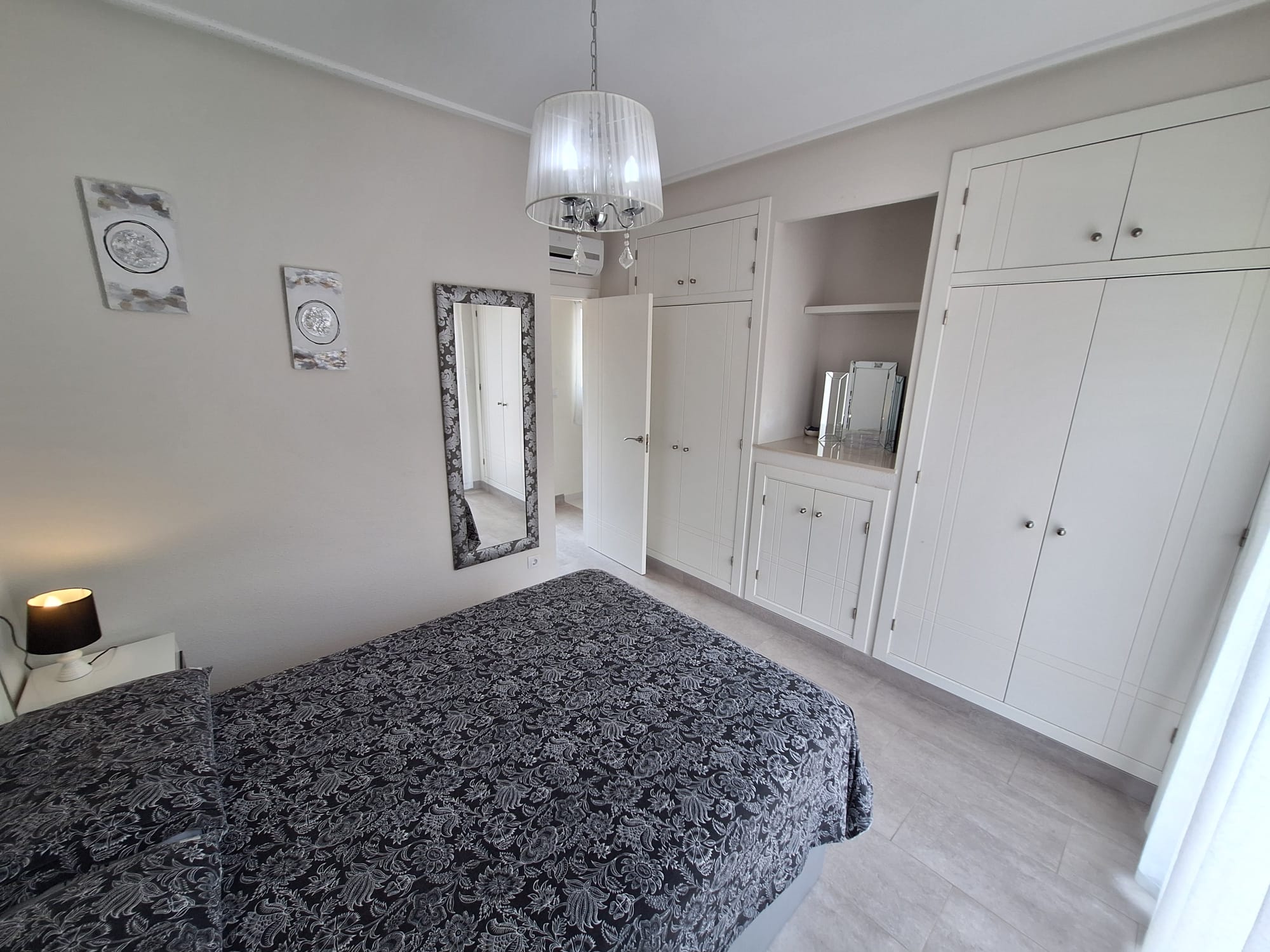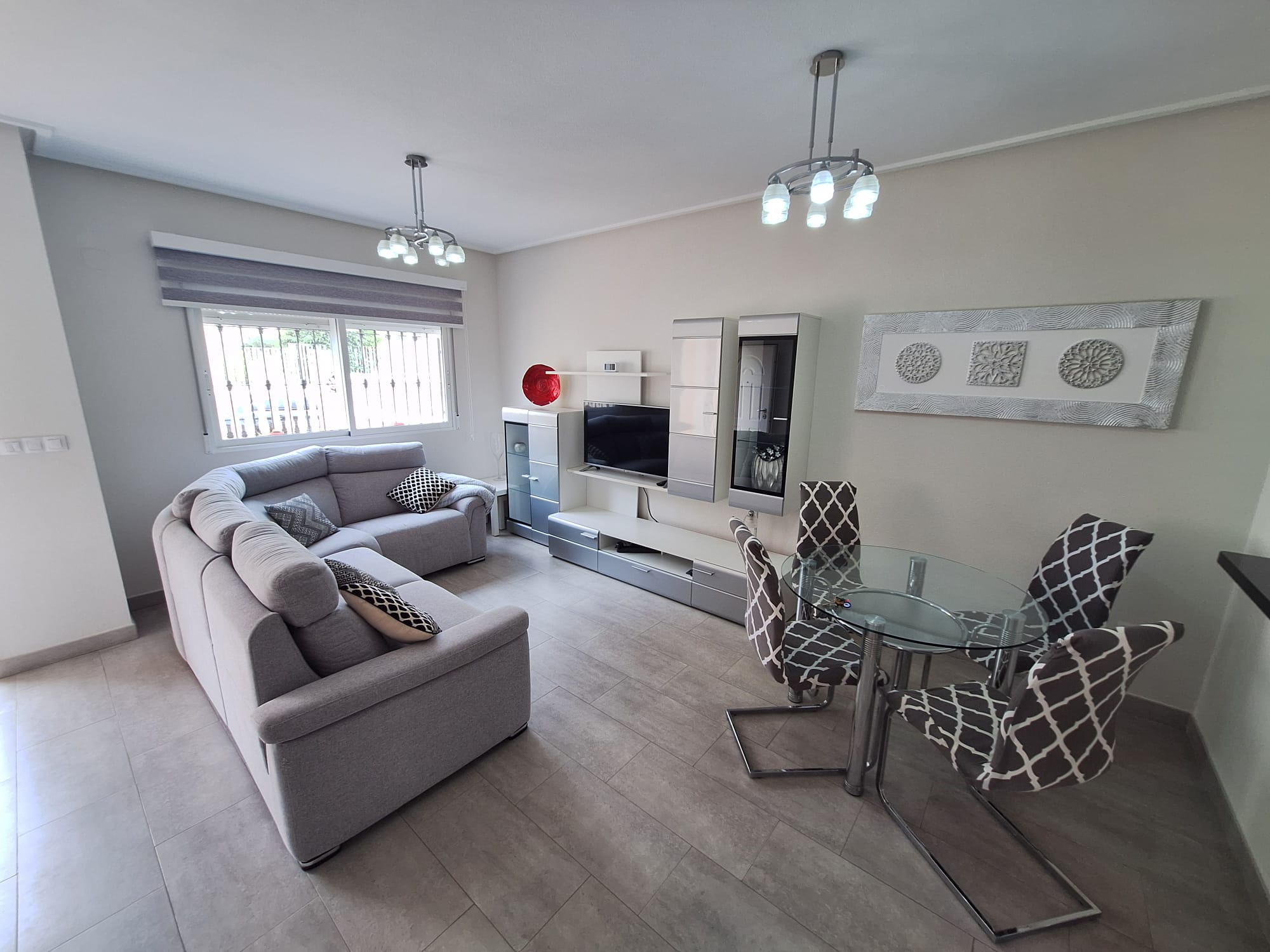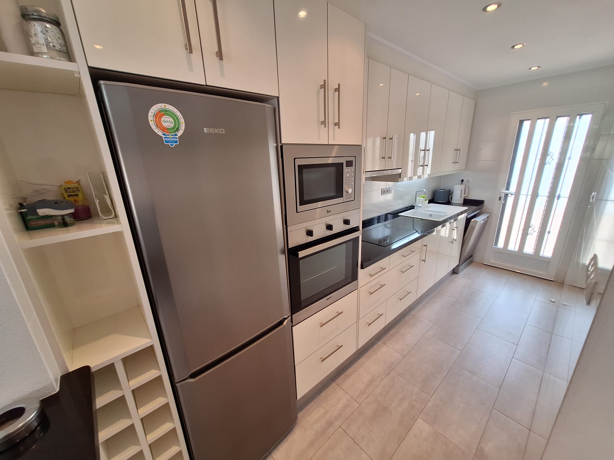 La vivienda ha sido completamente reformada y dispone de dos dormitorios acogedores con muebles y armarios espaciosos, dos baños modernos, cocina totalmente equipada con electrodomésticos, aire acondicionado, suelo radiante, lavavajillas y lavadora. Los interiores luminosos y de estilo moderno crean un ambiente agradable y confortable. La casa cuenta con dos amplias terrazas amuebladas, una de ellas con zona de barbacoa, además de un balcón. La urbanización cerrada ofrece zonas verdes ajardinadas y dos piscinas comunitarias, una de ellas climatizada.