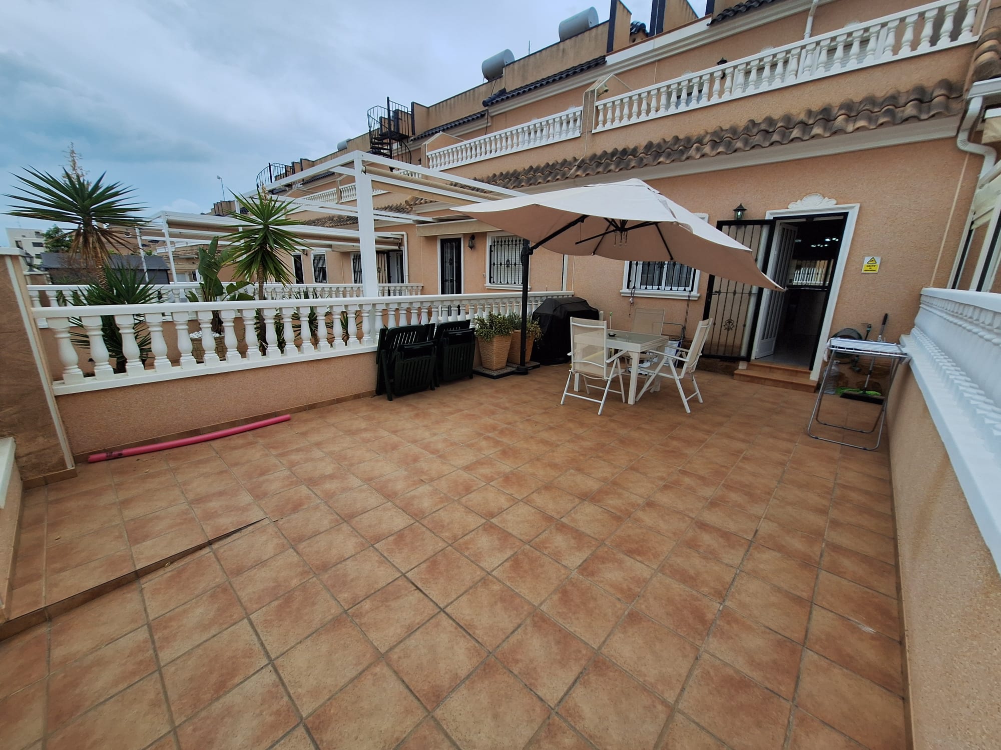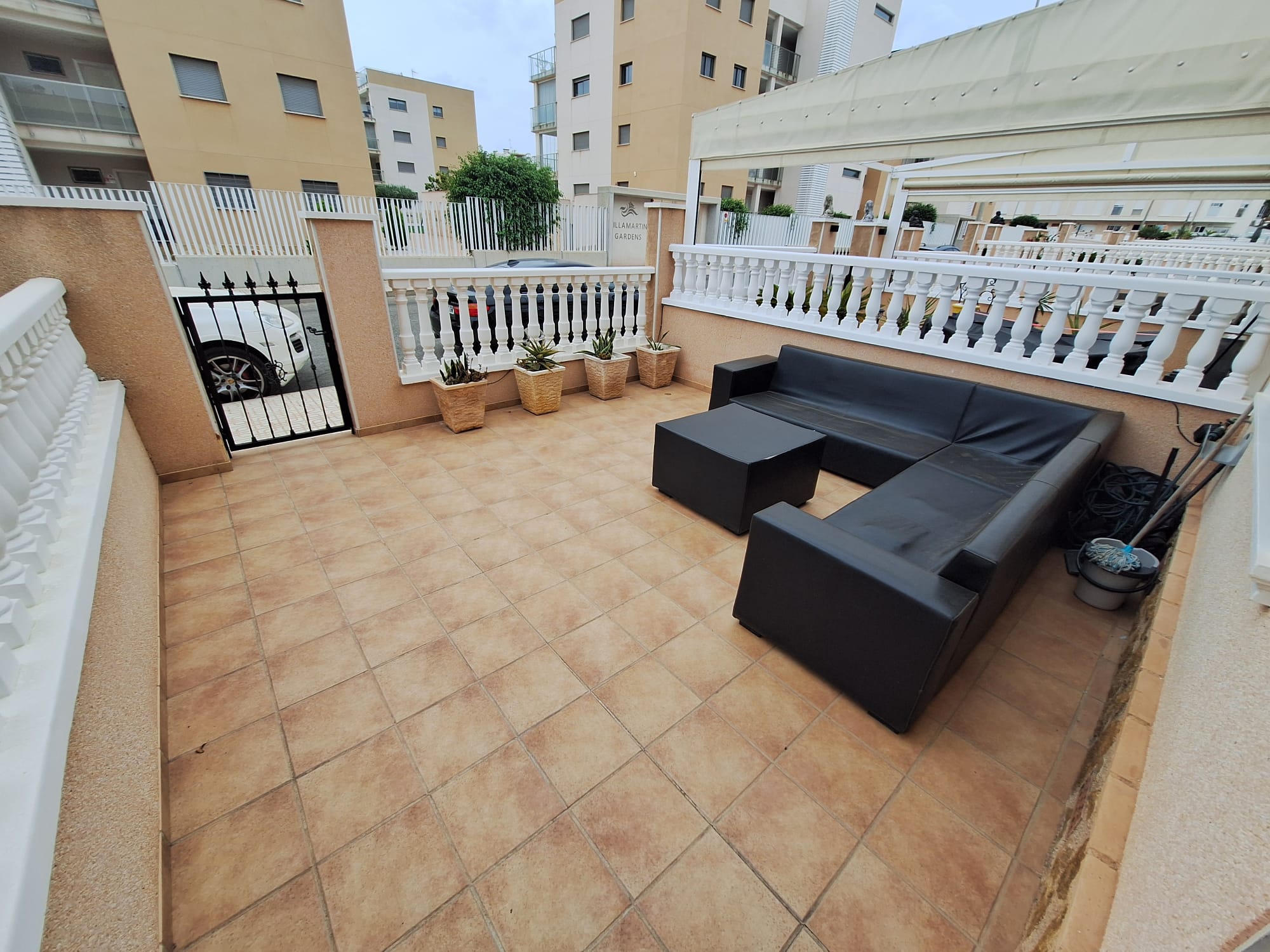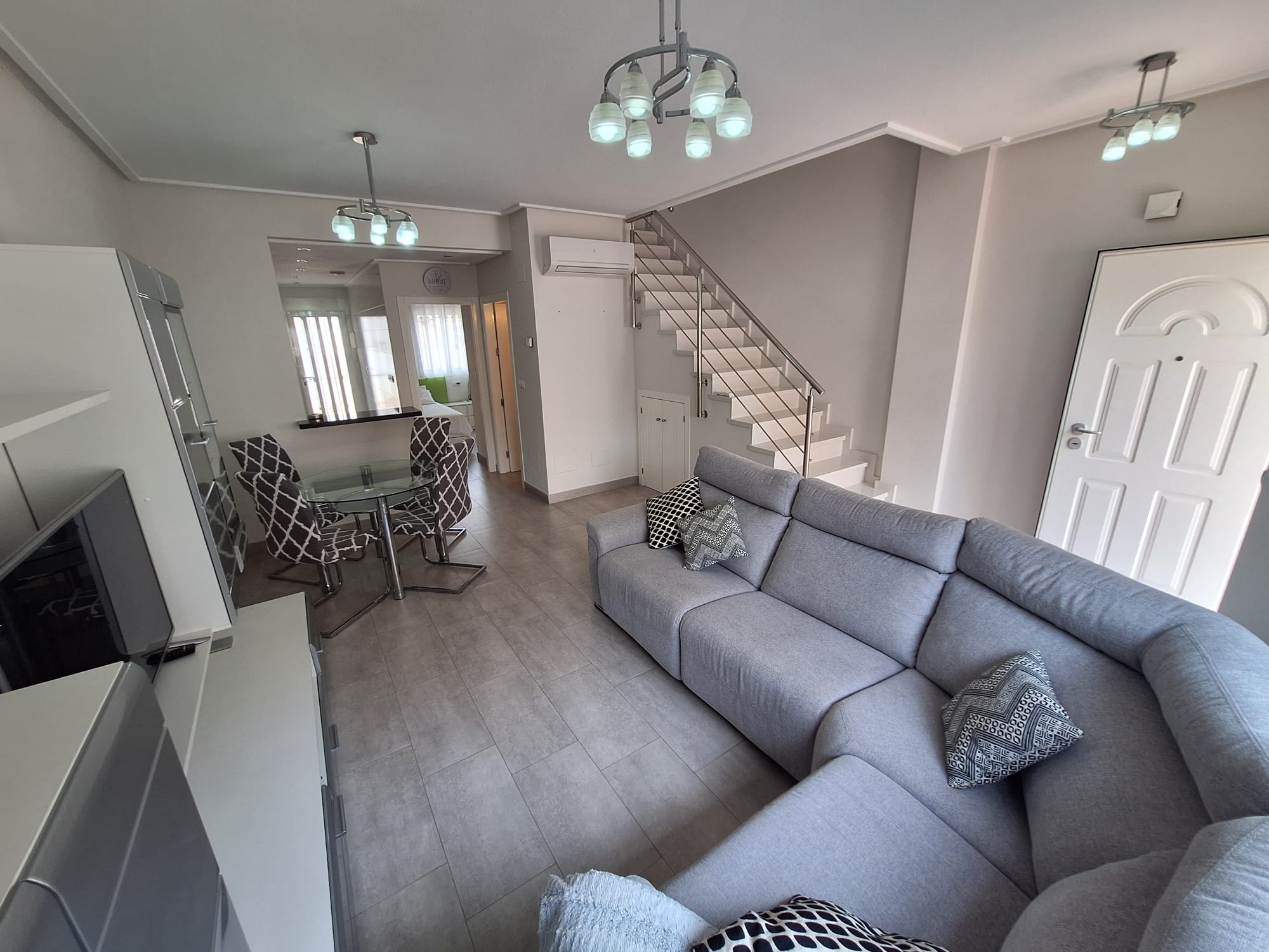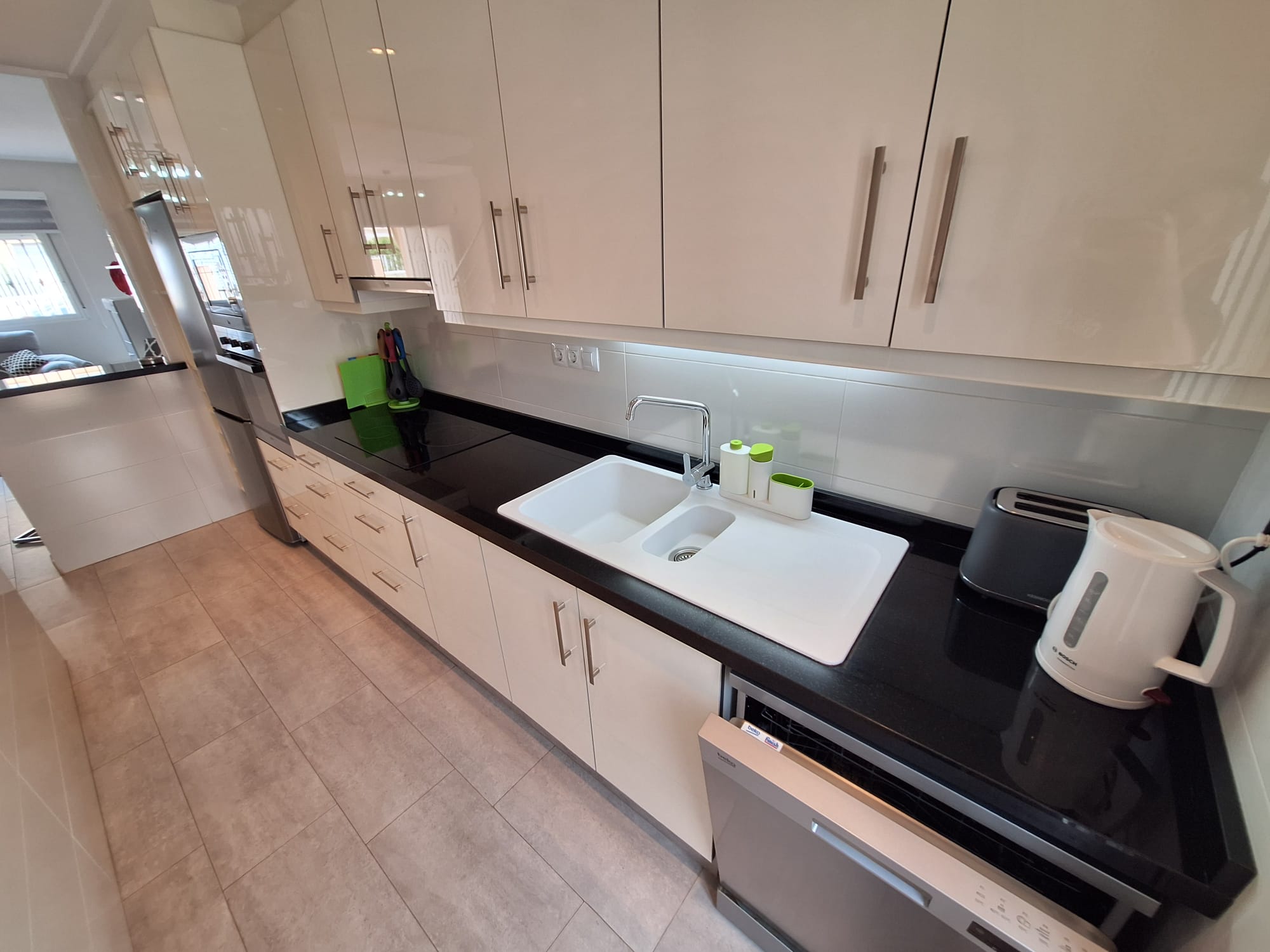 La vivienda ha sido completamente reformada y dispone de dos dormitorios acogedores con muebles y armarios espaciosos, dos baños modernos, cocina totalmente equipada con electrodomésticos, aire acondicionado, suelo radiante, lavavajillas y lavadora. Los interiores luminosos y de estilo moderno crean un ambiente agradable y confortable. La casa cuenta con dos amplias terrazas amuebladas, una de ellas con zona de barbacoa, además de un balcón. La urbanización cerrada ofrece zonas verdes ajardinadas y dos piscinas comunitarias, una de ellas climatizada.