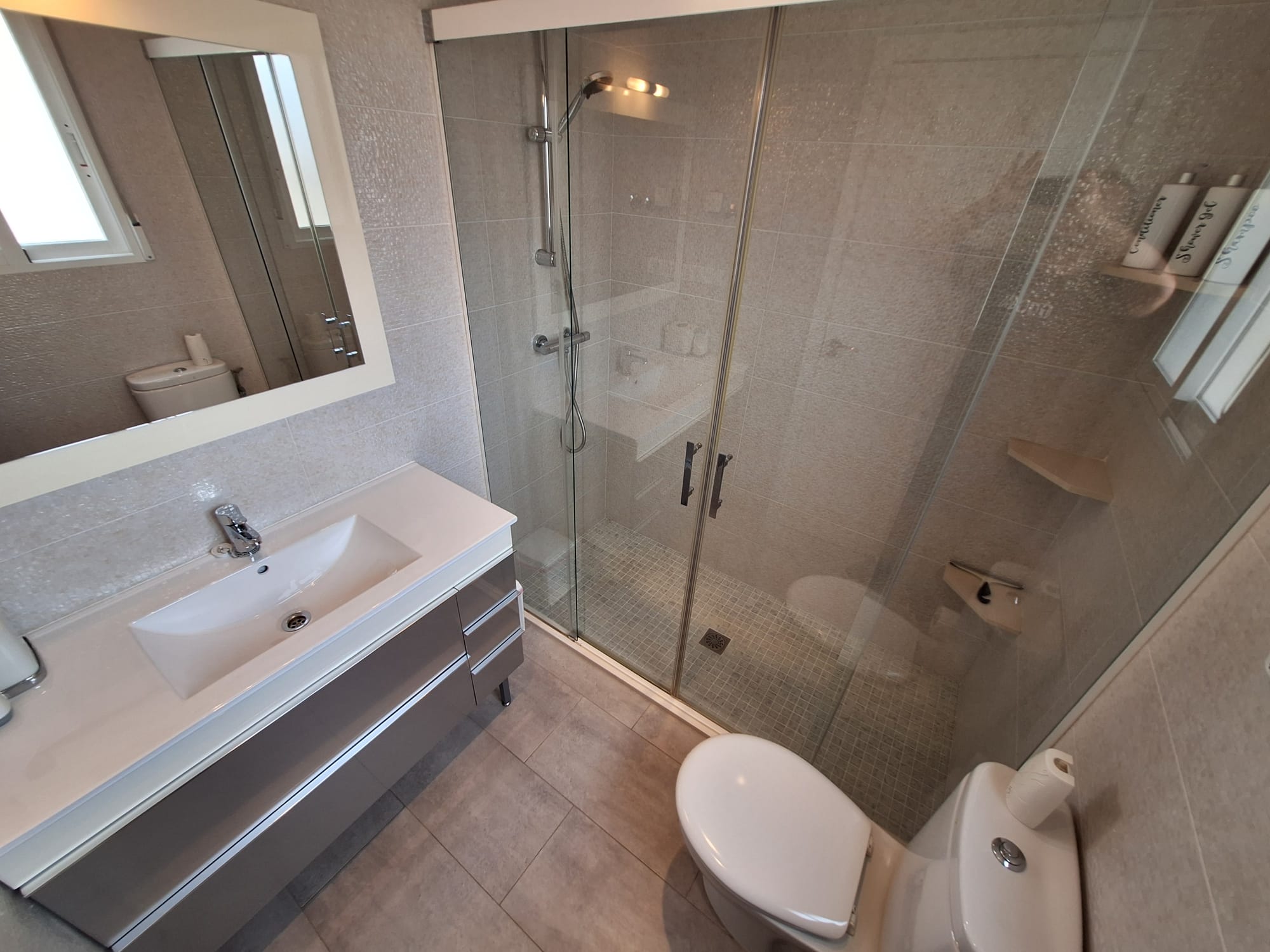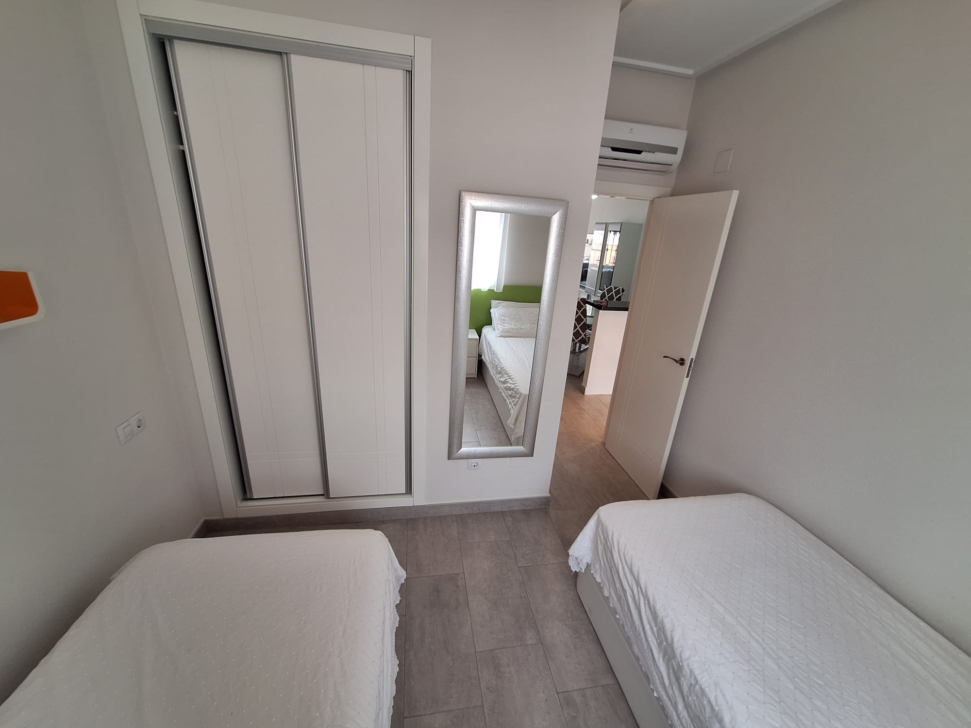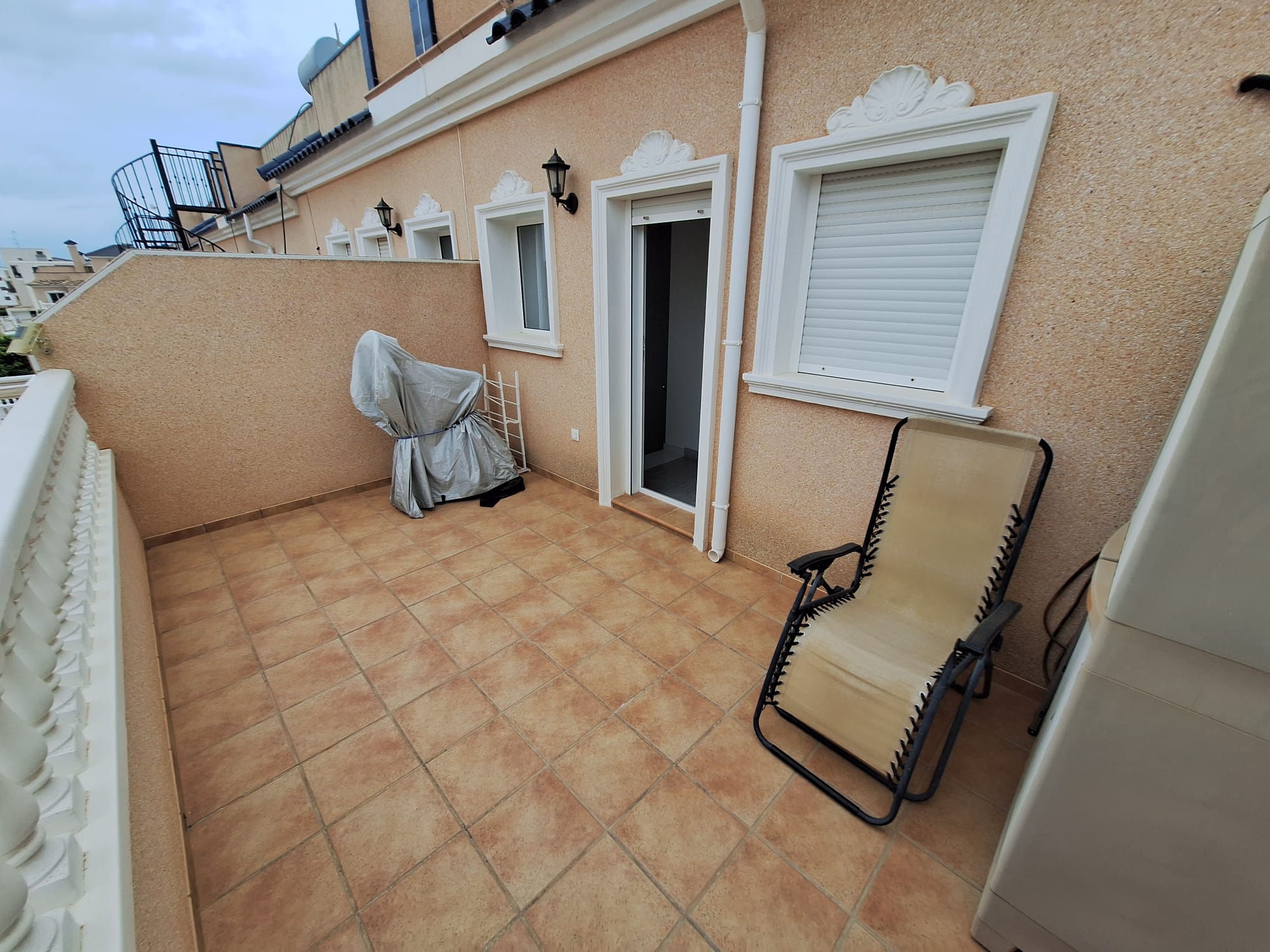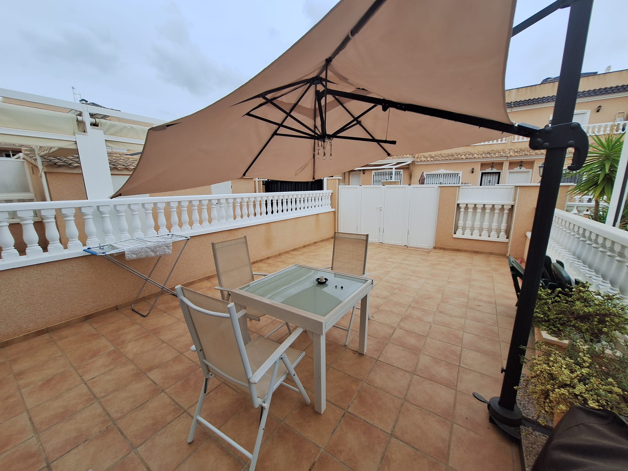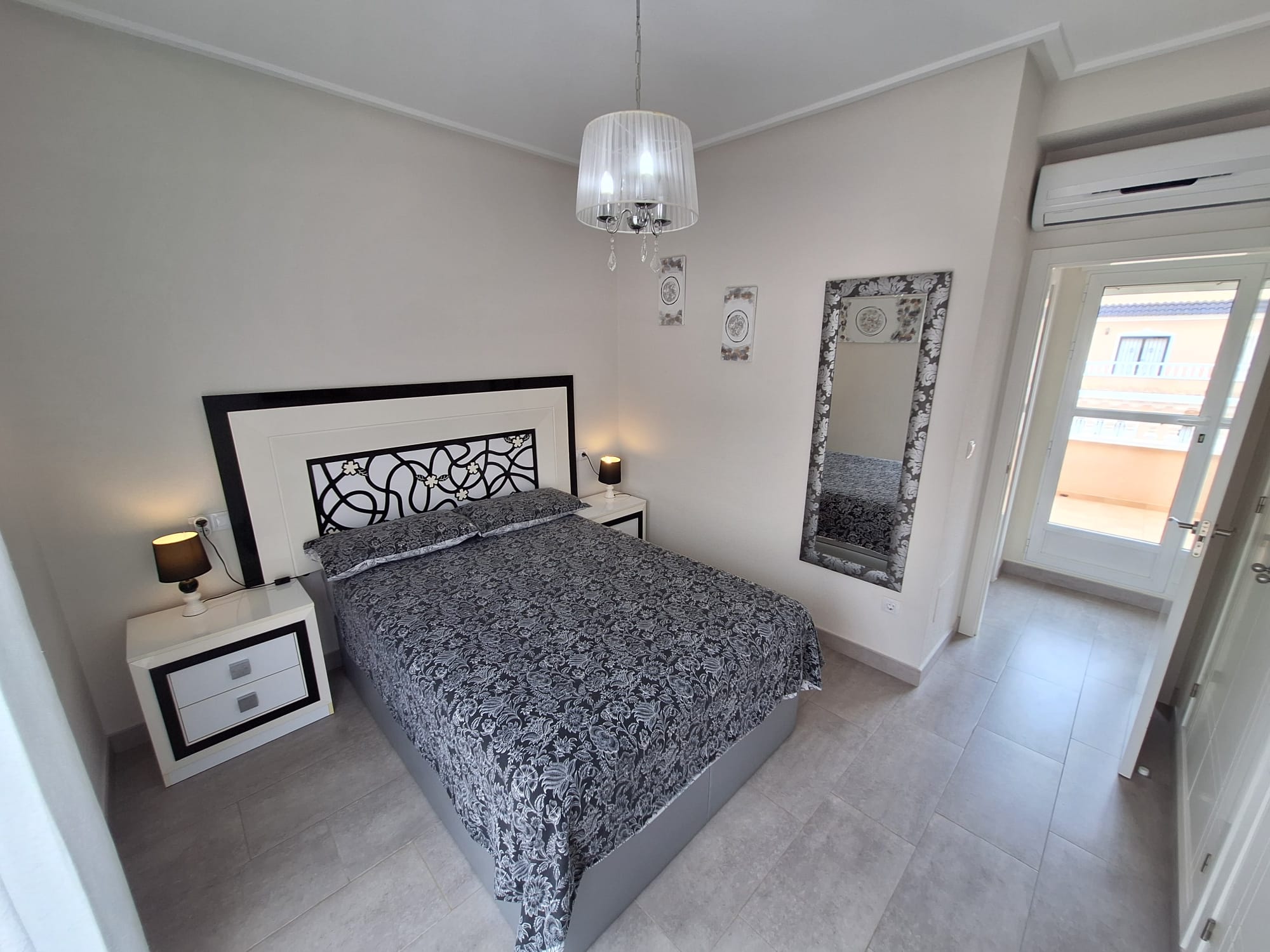La vivienda ha sido completamente reformada y dispone de dos dormitorios acogedores con muebles y armarios espaciosos, dos baños modernos, cocina totalmente equipada con electrodomésticos, aire acondicionado, suelo radiante, lavavajillas y lavadora. Los interiores luminosos y de estilo moderno crean un ambiente agradable y confortable. La casa cuenta con dos amplias terrazas amuebladas, una de ellas con zona de barbacoa, además de un balcón. La urbanización cerrada ofrece zonas verdes ajardinadas y dos piscinas comunitarias, una de ellas climatizada.