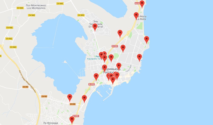 - Lotnisko Alicante: z Torrevieja (centrum), La Mata, El Chaparral i Los Balcones – 50 € w dzień (w dni powszednie) i 55 € w nocy (22:00 – 07:00), w weekendy i święta.