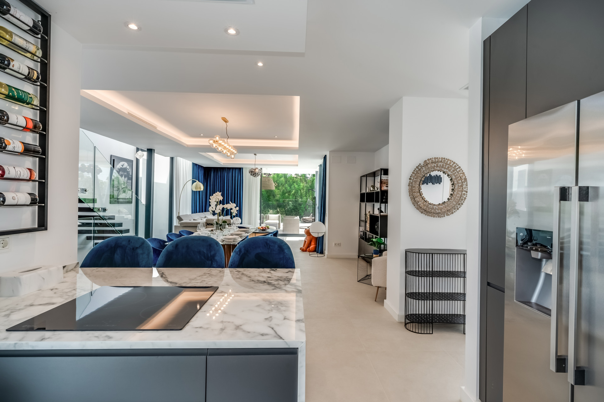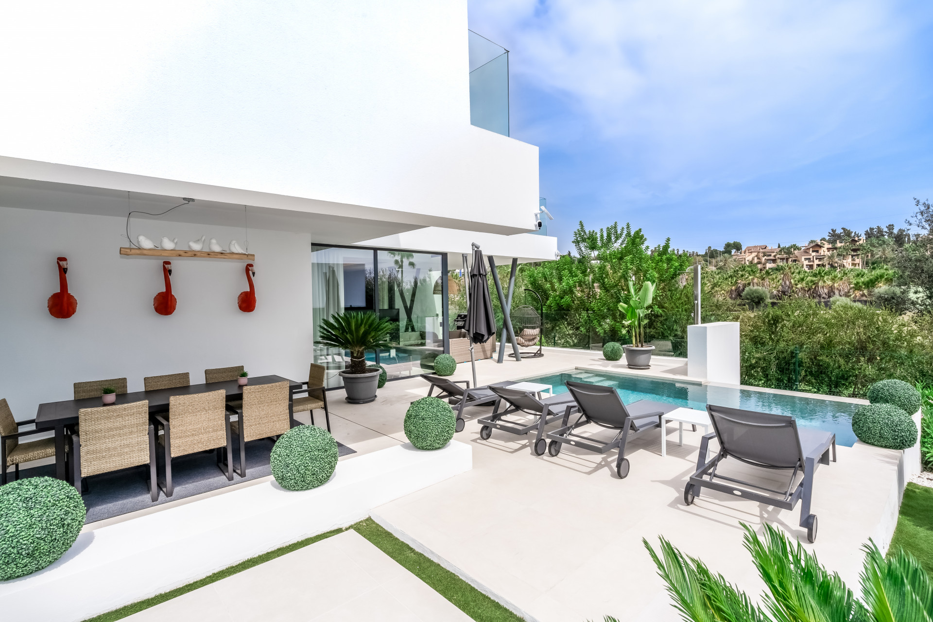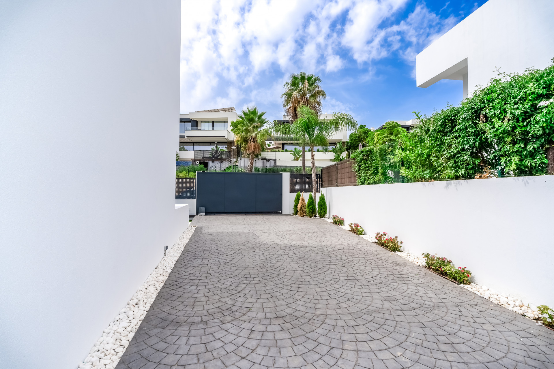 Вілла ідеально підходить для прийому гостей, пропонуючи простору лаунж-зону в підвалі з 75-дюймовим телевізором, додатковою кухнею та пральнею для зручності. Сонячні панелі сприяють енергоефективності, а високошвидкісний інтернет на оптоволокні покриває всю територію. Вілла розташована всього в кількох хвилинах від жвавого центру Марбельї та Пуерто-Бануса, поруч з ексклюзивними магазинами та ресторанами, пропонуючи неперевершене поєднання розкоші та зручності.