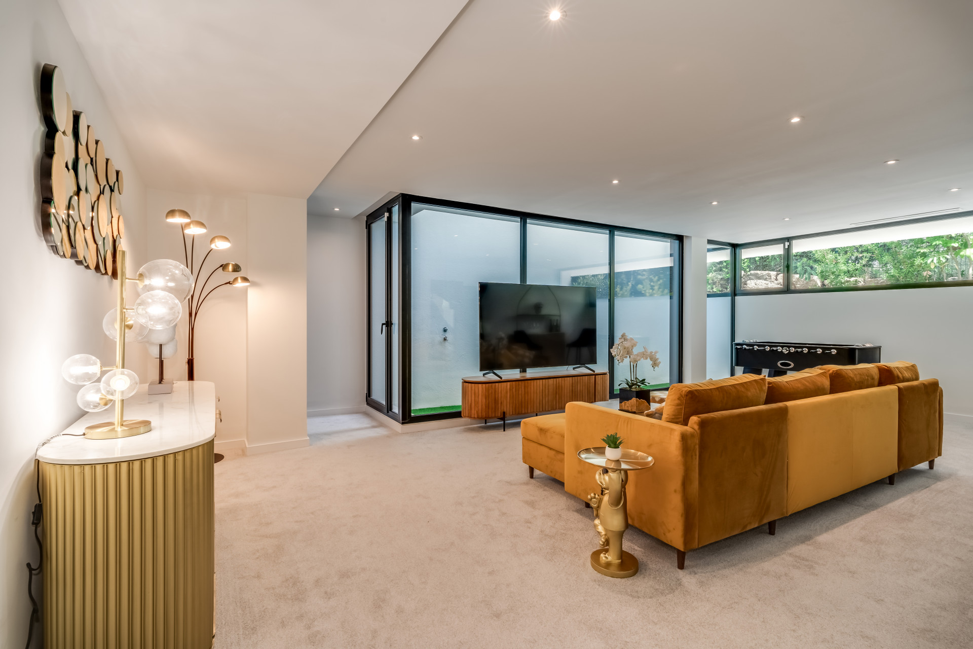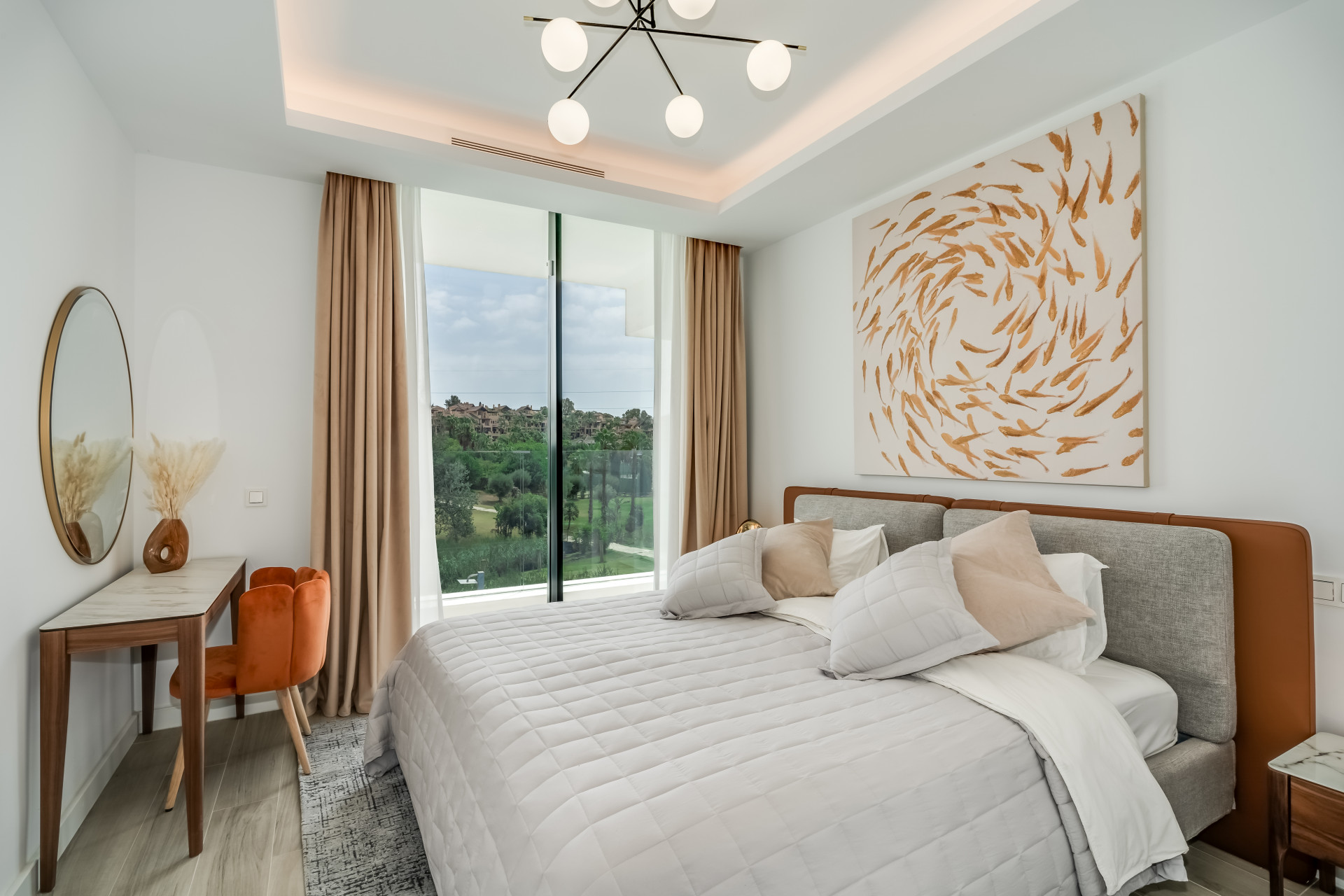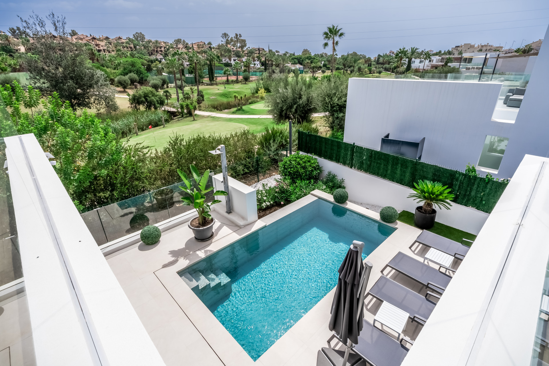 Інтер’єр вілли випромінює вишуканість, з підігрівом підлоги по всьому будинку та передовою системою кондиціювання Daikin Air Zone, яка гарантує ідеальну температуру протягом року. Кожен простір, від просторих спалень до елегантних ванних кімнат з душем, поєднує високоякісні матеріали та сучасну естетику, створюючи позачасову атмосферу. У центрі будинку розташована приголомшлива басейн infinity з підігрівом, з якого відкривається унікальний вид на поле для гольфу — ідеальне місце для відпочинку та насолоди природою.